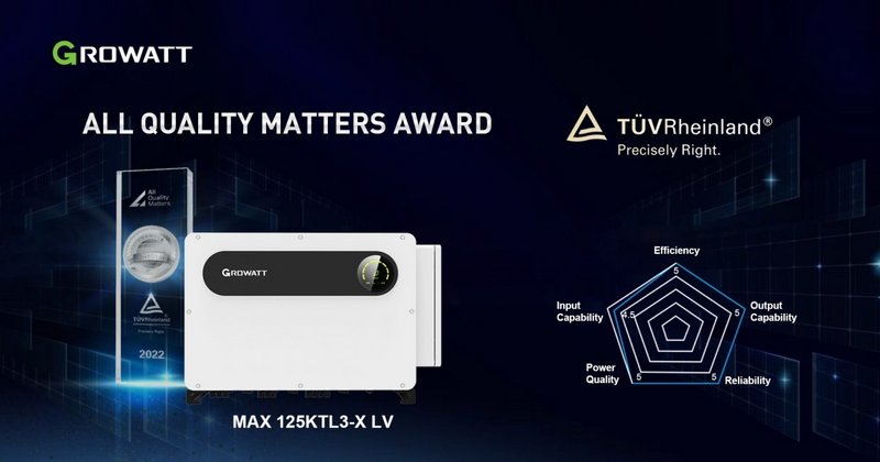 Na tegorocznym Kongresie Solarnym TÜV Rheinland 2022, Growatt otrzymał nagrodę „All Quality Matters” za swój inwerter C&I Growatt MAX 125 KTL3-X LV. Falownik uzyskał najwyższą wydajność w programie testowym jednostki certyfikującej spośród falowników z grupy 100-150 kW do zastosowań komercyjnych i przemysłowych (C&I).